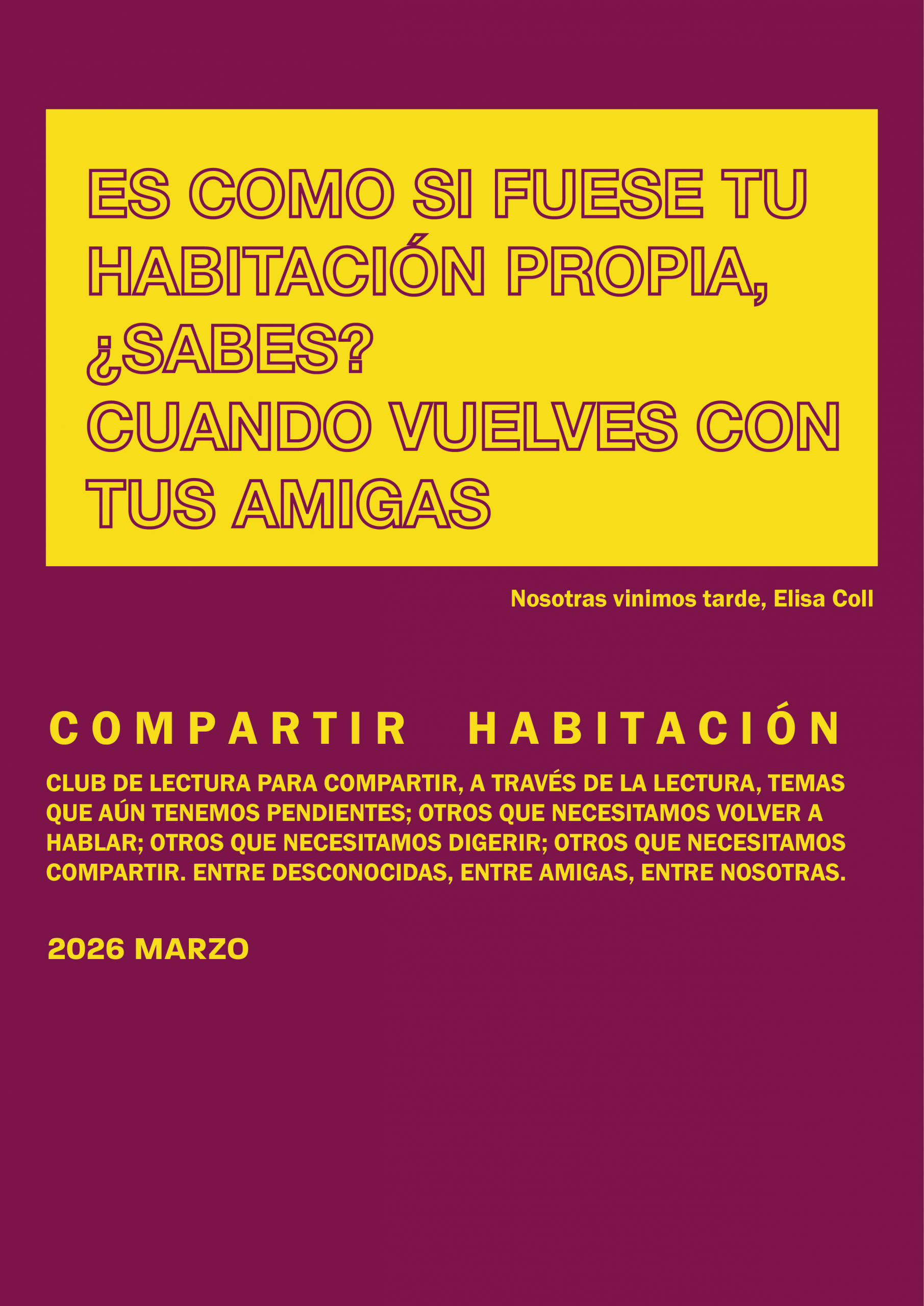 En Nosotras vinimos tarde, la autora recoge relatos pasados sobre convivencias alternativas y, desde ahí, se mira en el espejo de toda una generación que, marcada por las falsas expectativas y la precariedad, siente que llega a todo demasiado tarde. Un relato que, desde la ternura, el ingenio y la crudeza, desgrana temas como el fracaso, la amistad, los duelos o las violencias en espacios que suponemos seguros. Con esta obra, Coll nos reta a pensar en cómo construimos los espacios a los que llamamos casa y de qué formas los habitamos para, desde ahí, llevarnos a otros lugares desde los que reimaginar el futuro.